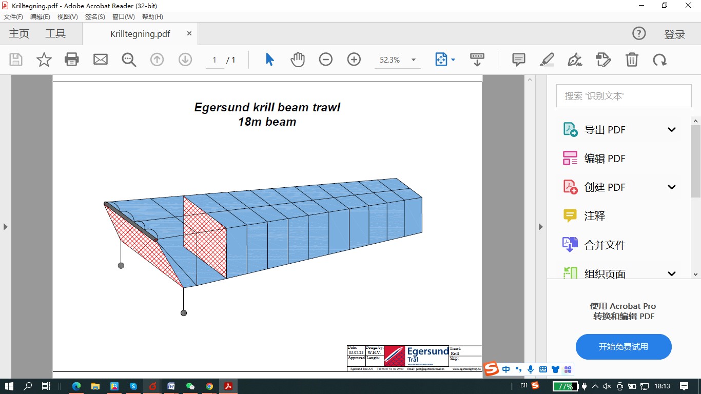 Midwater Otter Trawl Net-mouth height: 18m Net-mouth width: 23m Total net length: 168.8m Codend-mouth height: 2m Codend-mouth width: 2m Codend length: 24m Codend mesh size: 11mm Mammal exclusion device type: Large mesh panel across mouth/first section of net Mammal exclusion device diagram: Gear diagram: |