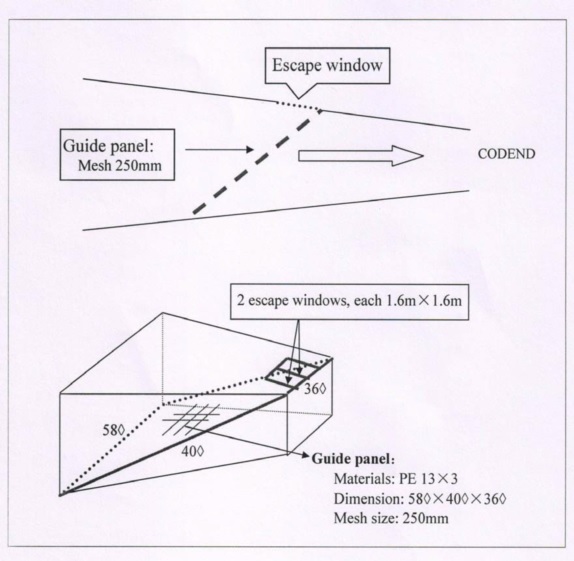 Midwater Otter Trawl Net-mouth height: 30m Net-mouth width: 29m Total net length: 268.32m Codend-mouth height: 3.4m Codend-mouth width: 3.4m Codend length: 50m Codend mesh size: 20mm Mammal exclusion device type: Oblique panel in net leading to escape window Mammal exclusion device diagram: Gear diagram: |