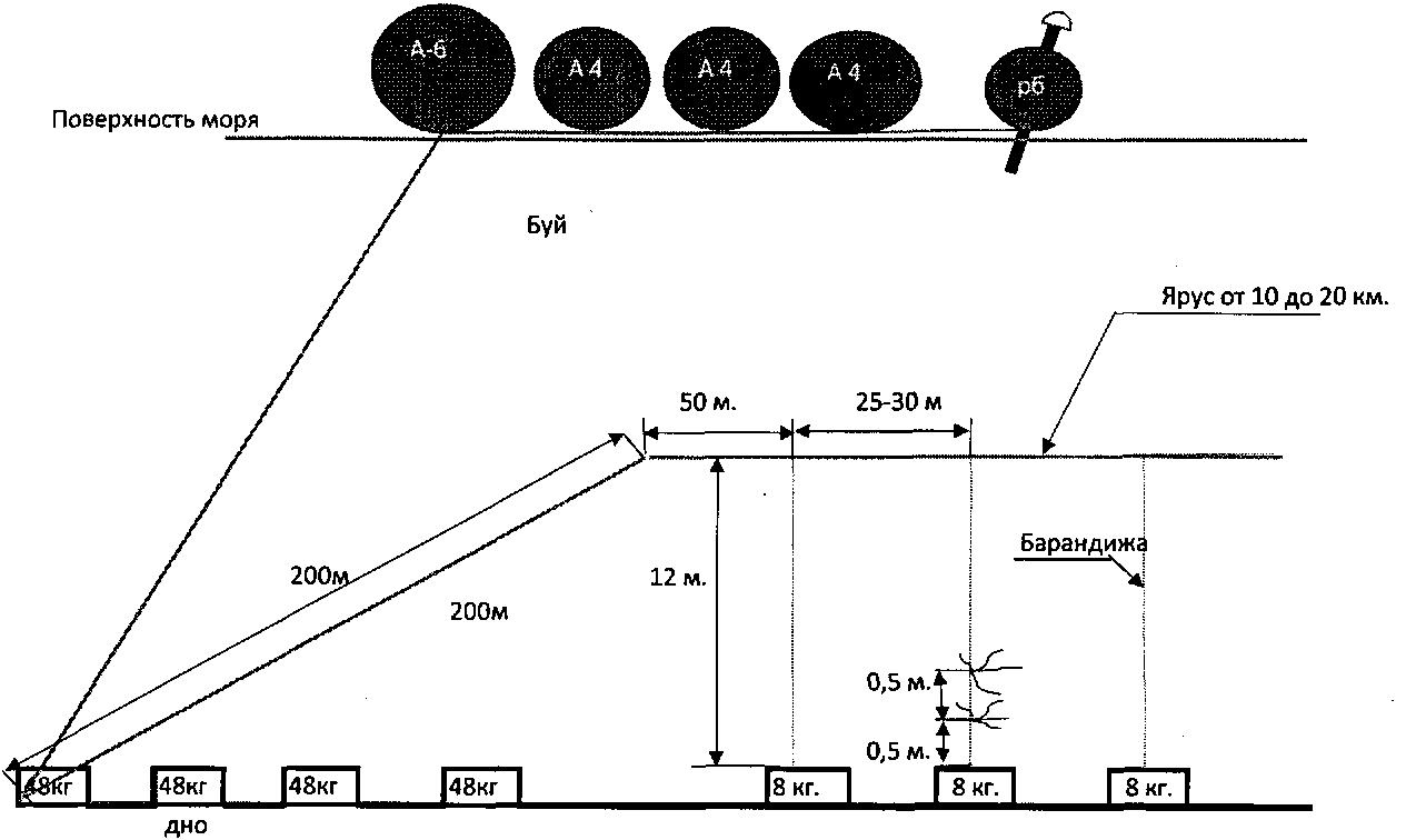 Trotline Longline weights: Yes Longline Weight material: Concrete Minimum mass of longline weights: 8kg Maximum spacing between longline weights: 25m Number of hooks per cluster: 4 Spacing between cluster hooks: 0.5m Spacing between drop lines: 25m Number of clusters on a dropline: 3 Gear diagram: |
