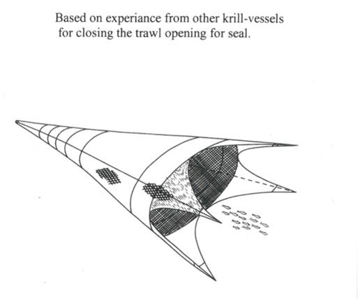 Midwater Otter Trawl Net-mouth height: 30m Net-mouth width: 30m Total net length: 128.5m Codend-mouth height: 3.8m Codend-mouth width: 7.6m Codend length: 31m Codend mesh size: 15mm Mammal exclusion device type: Oblique panel in net leading to escape window Mammal exclusion device diagram: Gear diagram: |